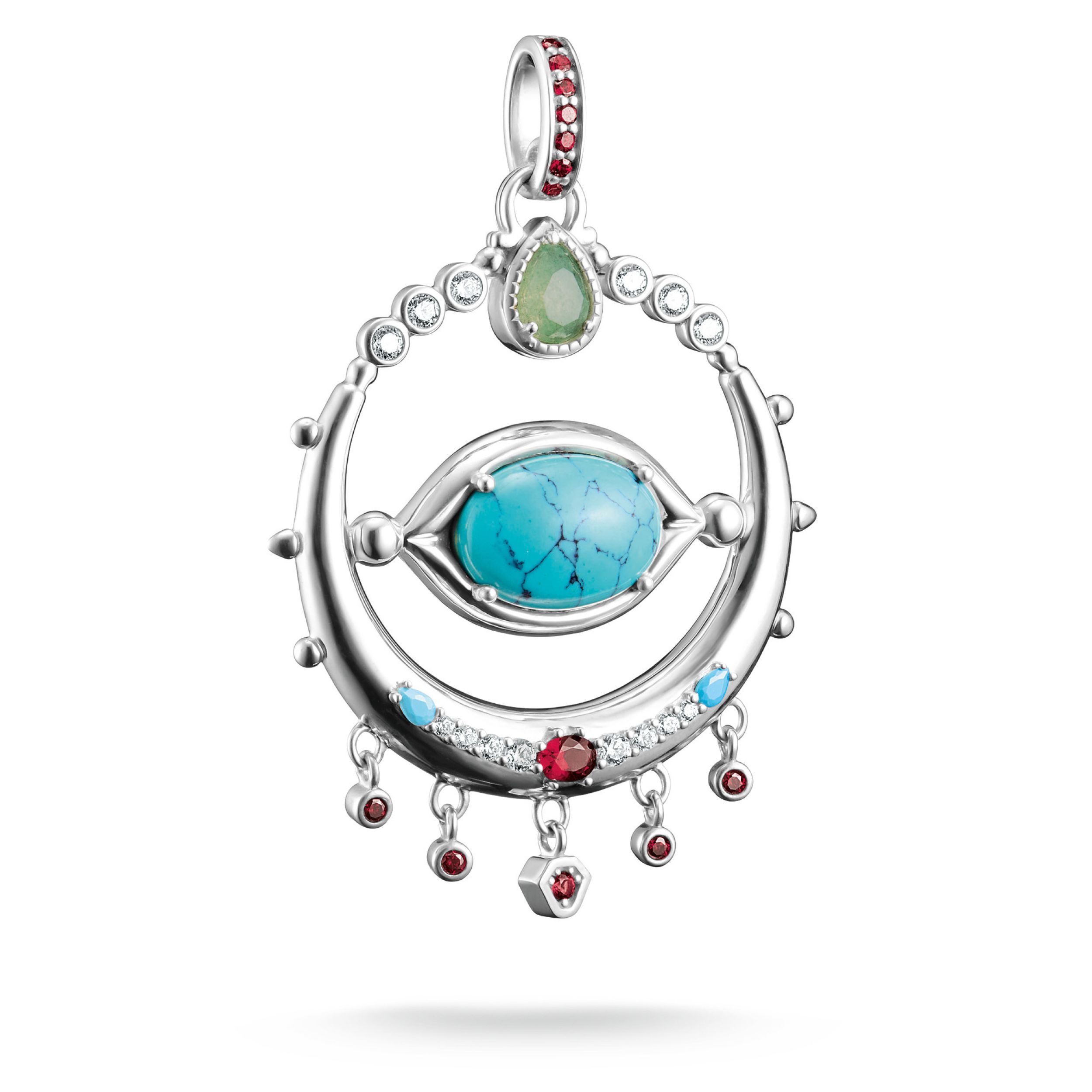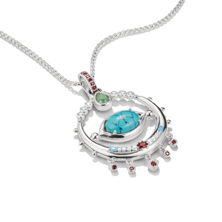 Deze rijkelijk ontworpen amulethanger, gemaakt van gerecycled 925 sterling zilver, is een van de belangrijkste stukken van de Elyndra-collectie. In het midden bevindt zich een ovaal imitatie-turquoise in cabochon-slijpvorming, gestileerd als een oog en omlijst door wit en granaatrood zirkonia.