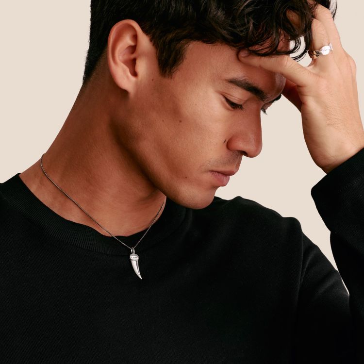 Deze ketting met tandhanger is een krachtig symbool van oerkracht en onafhankelijkheid. De hanger, gemaakt van geoxideerd 925 sterling zilver, maakt indruk met zijn organische silhouet en gedetailleerde gravures, wat hem een talismanachtige aura geeft.
