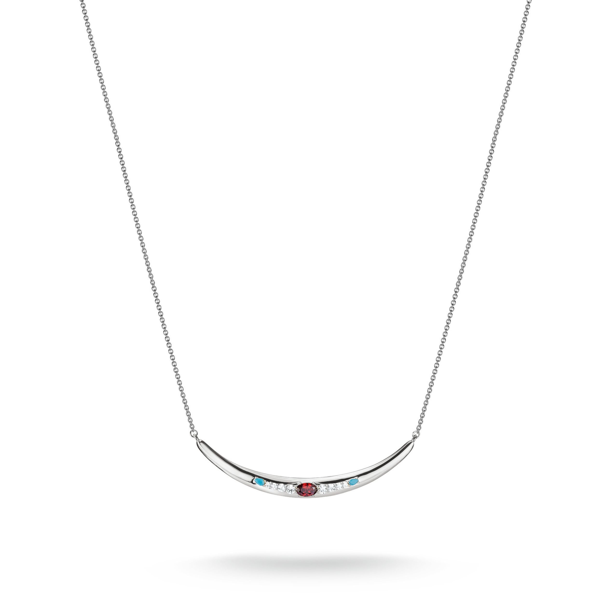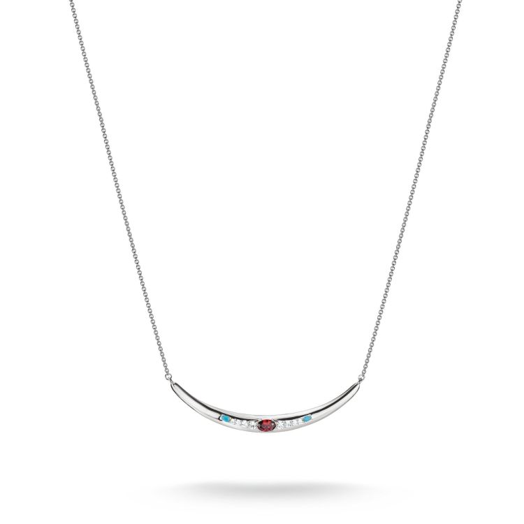 Als een gefocuste gedachte aan licht: het massieve halve maan middelpunt heeft een fijn gecoördineerde rij stenen – in het hart een granaatrood zirkonia, geflankeerd door witte en turquoise edelstenen. Kalme lijnen ontmoeten expressieve symboliek, waardoor je een heldere, evenwichtige aanwezigheid krijgt. Een Elyndra-ketting voor momenten waarop je lichtheid met diepte mengt.