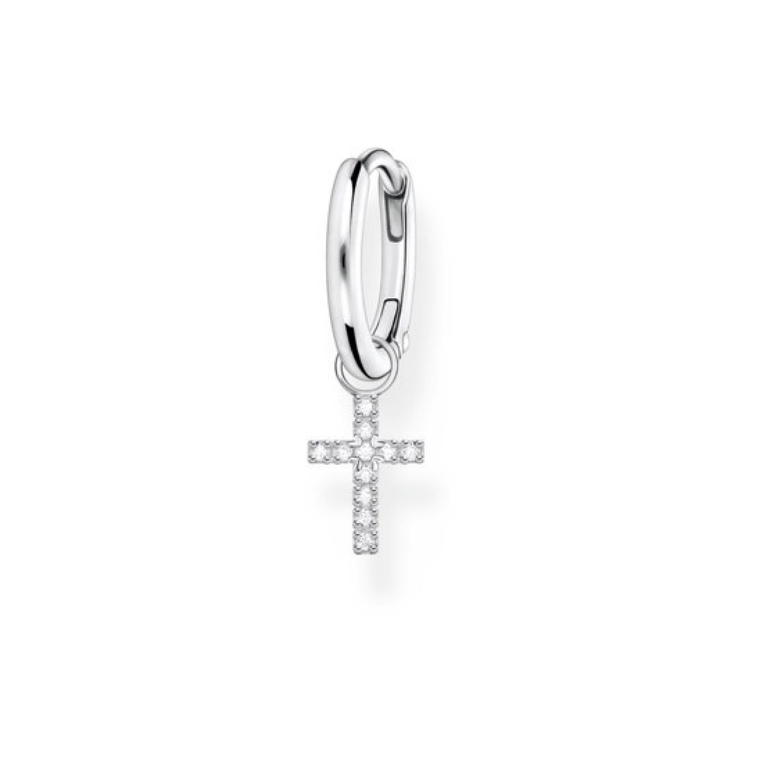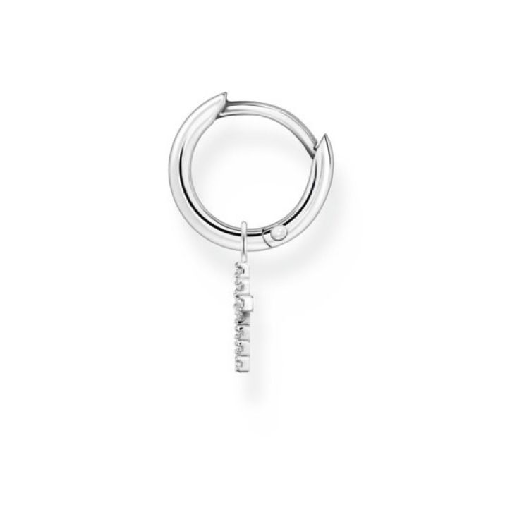 Het ontwerp van de enkele hoepel is grafisch gereduceerd in een klassieke cirkelvorm en schittert met zijn geperfectioneerde minimalisme. Gemaakt van puur gerecycled 925 sterling zilver, heeft de creool een buitendiameter van 13,5 mm. Het kan afzonderlijk gedragen worden of gecombineerd met de oorbelhanger. De hanger heeft een klassiek kruisontwerp, is ook gemaakt van gerecycled 925 sterling zilver en is bezet met fonkelende witte zirkonia stenen. De hanger kan eenvoudig aan de ring worden bevestigd. Het meegeleverde oogje heeft een binnendiameter van 2,5 mm.