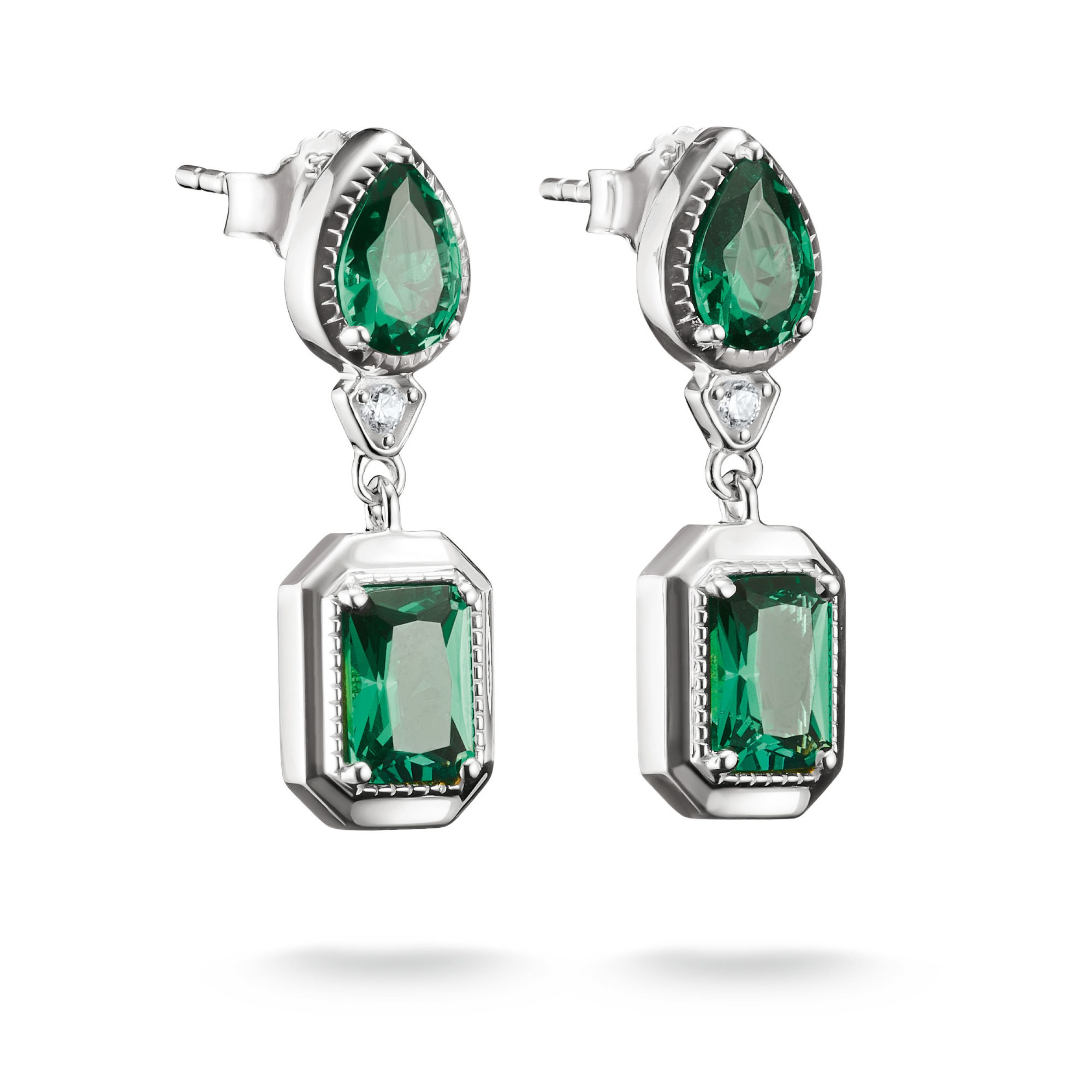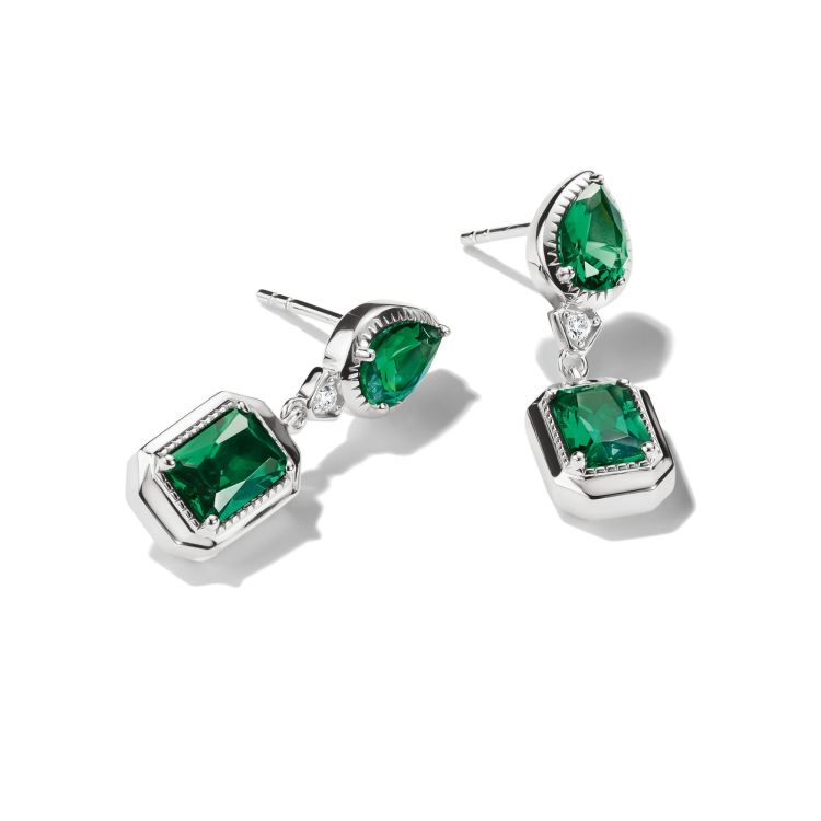 Deze Elyndra stud-oorbellen spelen met een spannende balans tussen vorm en kleur. Een smaragdgroene peer-geslepen steen staat boven een achthoekig geslepen steen in dezelfde tint, wat een elegante verticale silhouet creëert.