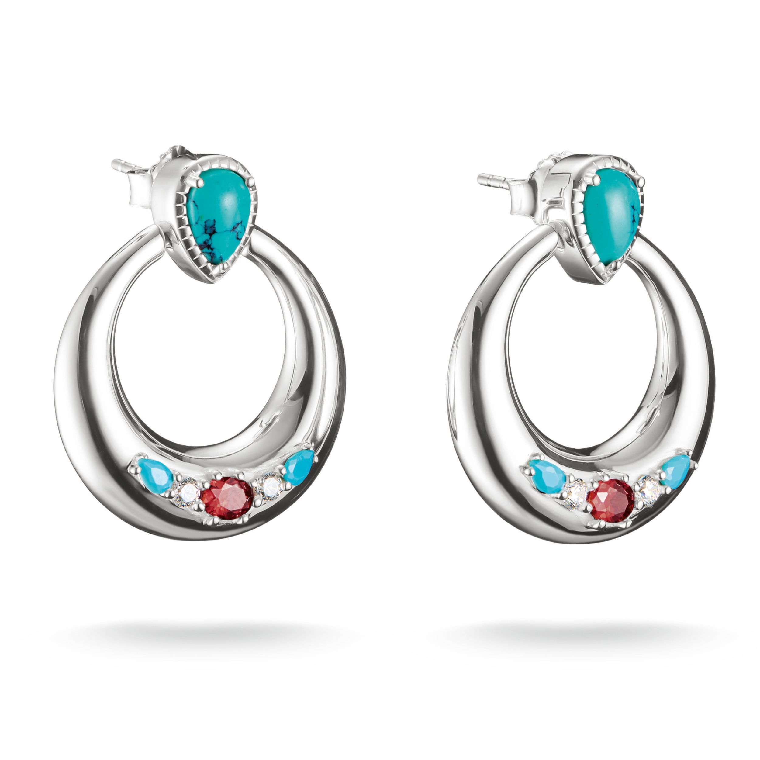 Zilveren halve hoepeloorbellen met turquoise, witte en rode stenen