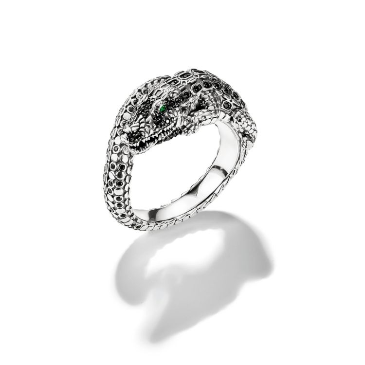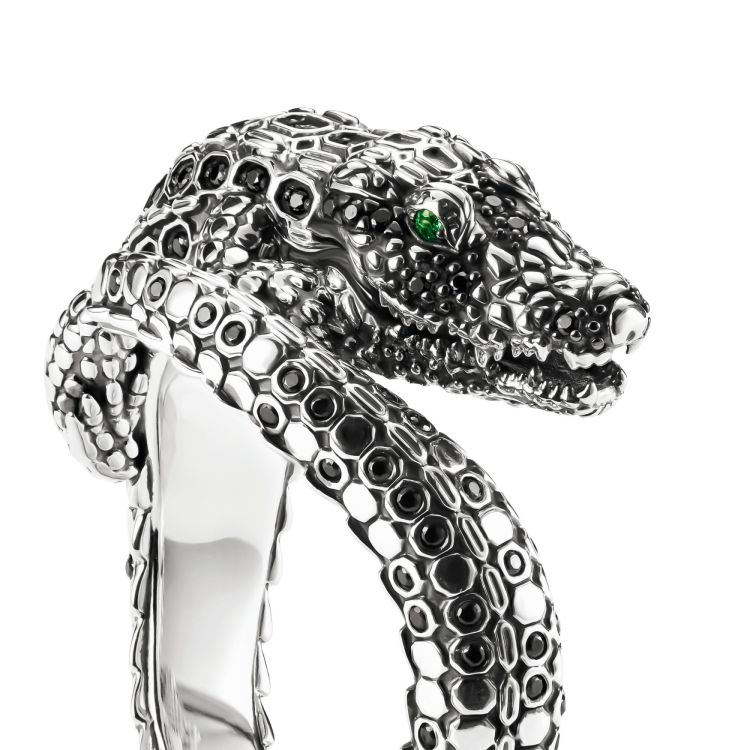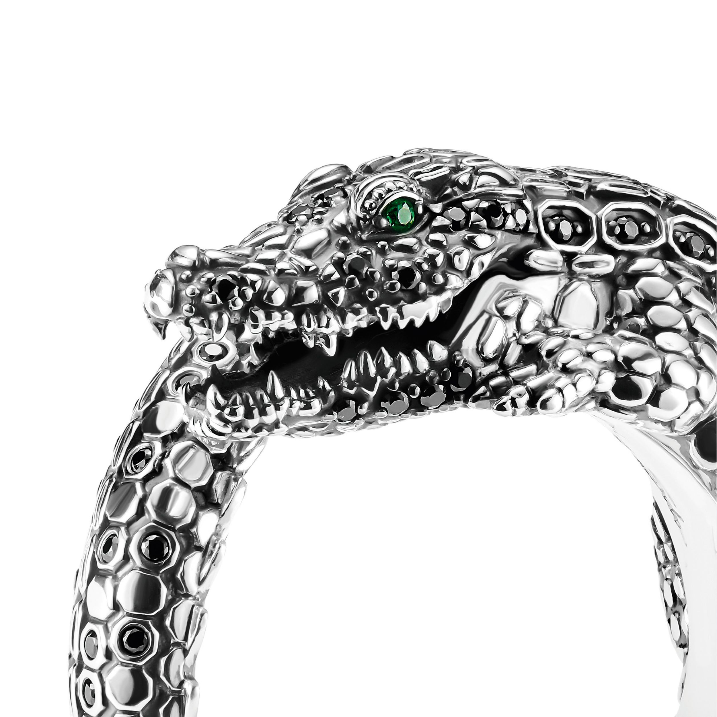 Fascinerende krokodil: de exclusieve ring is gemaakt van hoogwaardige, gerecyclede 925 sterling zilveren en is kunstig en rijkelijk ontworpen in de vorm van een kronkelende krokodil. Het lijkt perfect op een krokodil, dankzij zijn 3D-uitstraling, fijne gegraveerde lijnen, de reptielachtige schelp, puntige tanden en fonkelende ogen. Handgezette zwarte zirkoniastenen in verschillende maten en vormen accentueren de ring. Smaragdgroene stenen laten de ogen van de krokodil op mystieke wijze glanzen. Om een hoog comfortniveau te garanderen, wordt de ringschacht voorzichtig afgerond. Dit sieraad is het perfecte cadeau voor een speciale gelegenheid.