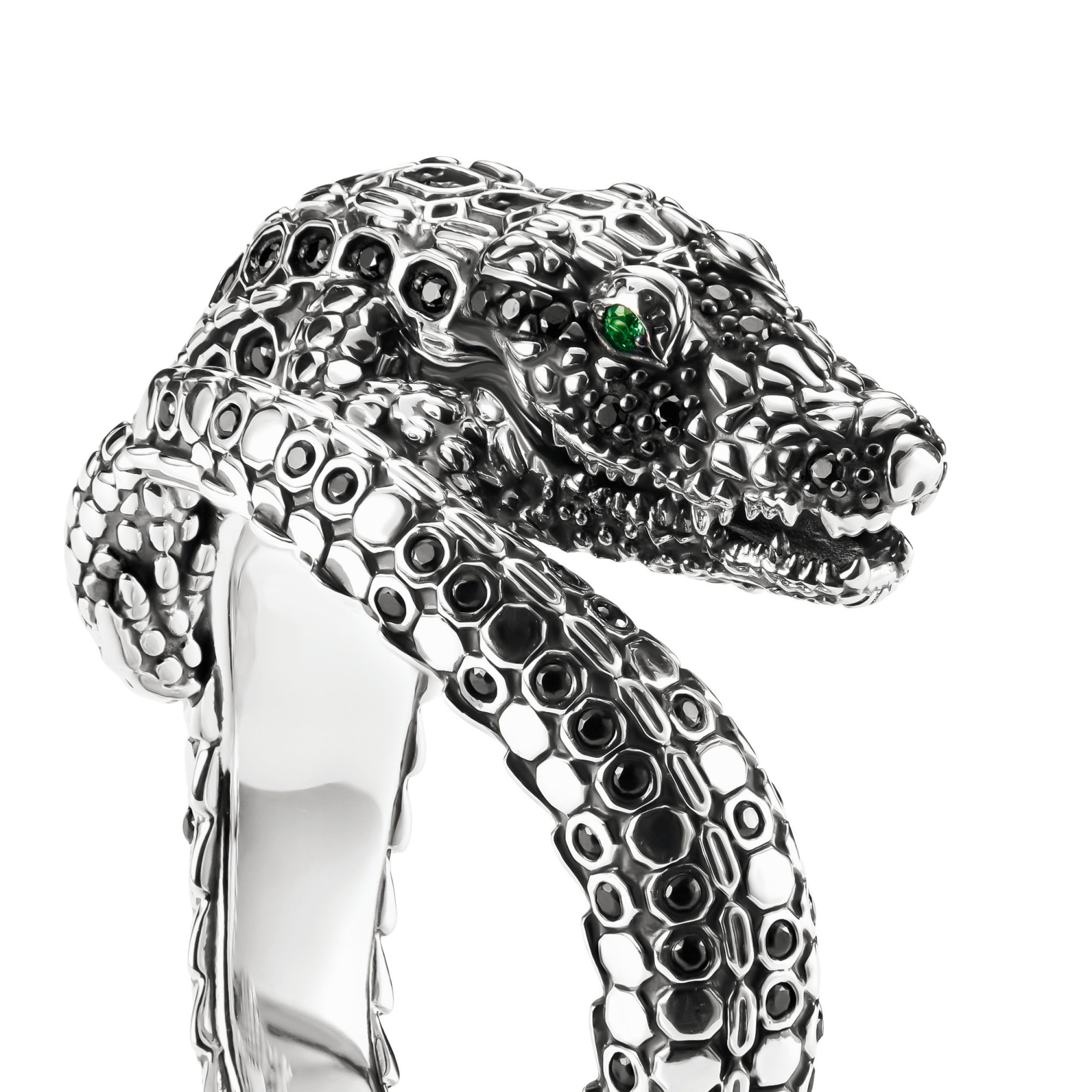 Kunstig en rijkelijk ontworpen in 3D, met fijne gegraveerde lijnen en met de hand gezette stenen in zwart en smaragdgroen