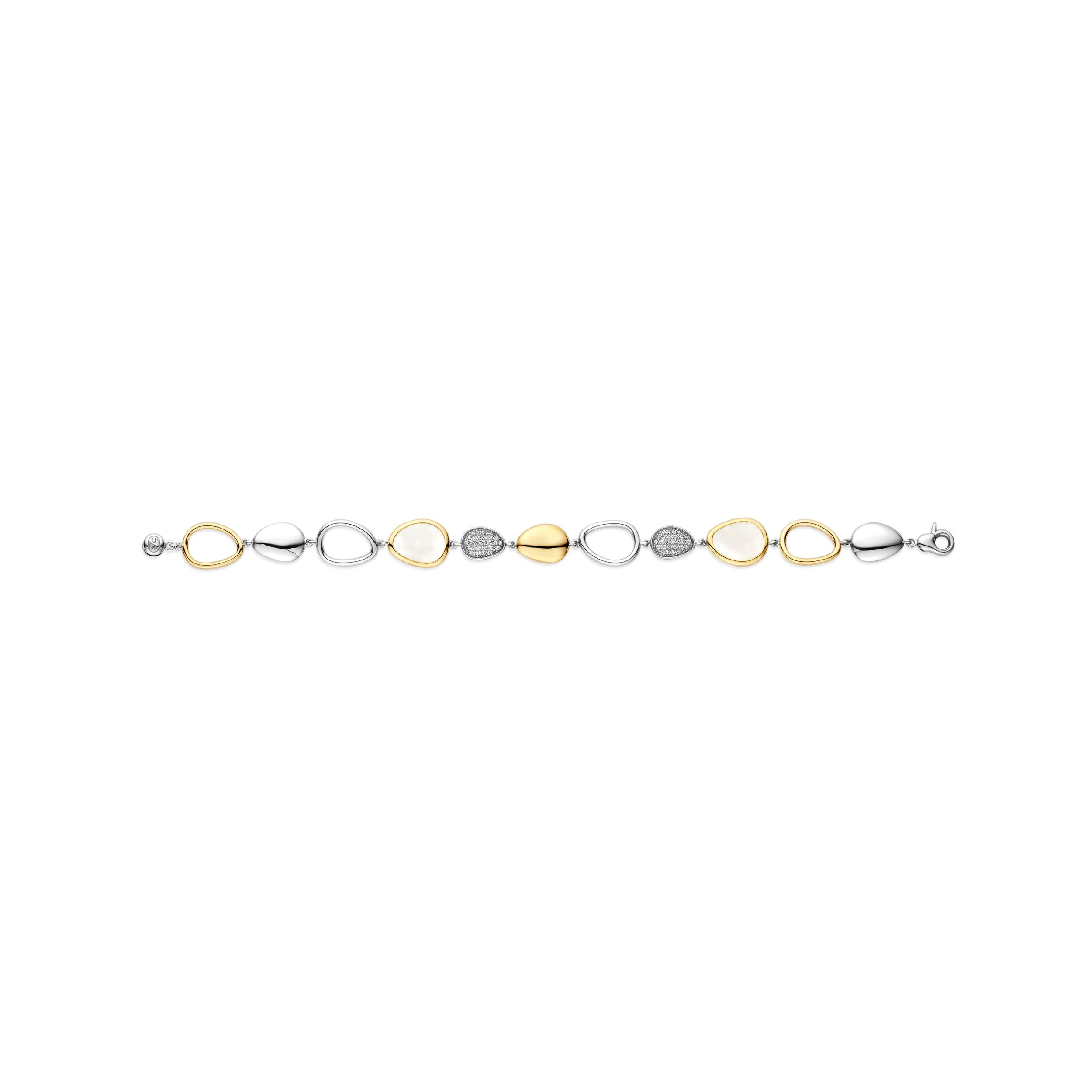Verhoog sculpturale glans met deze TI SENTO zilveren armband 23082MW. Zorgvuldig vervaardigd uit 925 sterling zilver, verbindt het sieraad een reeks pebble-vormige charms tot één vloeiende lijn: een melkachtig witte fantasy-cut steen omlijst met goudkleurig verguld, een gepolijste goudkleurig vergulde pebble, pavé-schijfjes bezet met briljant witte cubic zirconia, en opengewerkte platinakleurig vergulde accenten die luchtige negatieve ruimte creëren. Het resultaat is een ritmisch spel van licht, kleur en textuur dat de pols omhult met directe elegantie. Draag de armband solo voor een gallery-waardige impact, of combineer hem met minimalistische bangles voor extra diepte. Nikkelvrij en hypoallergeen, verfijnd voor de gevoelige huid en met luxe comfort dat de hele dag aanhoudt.