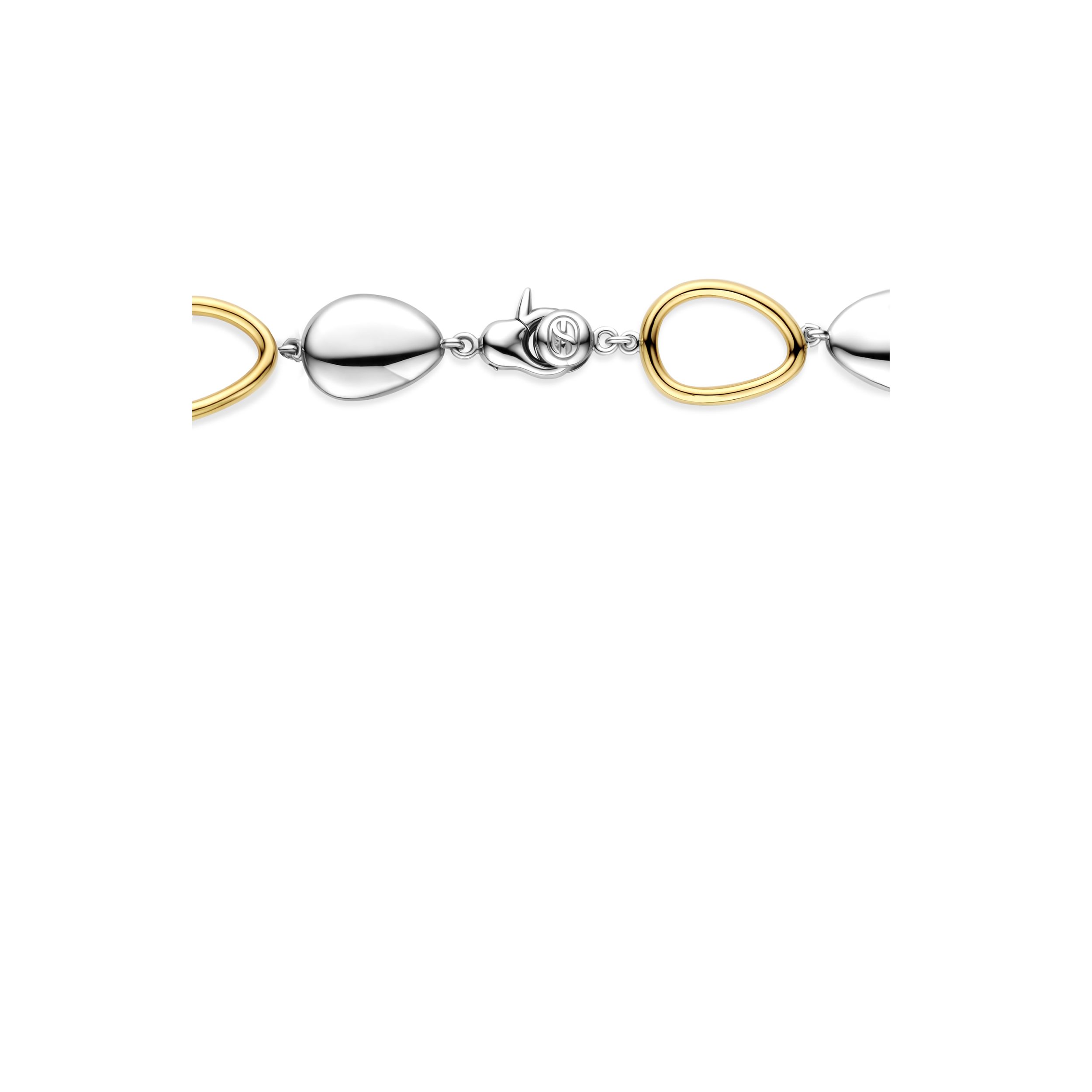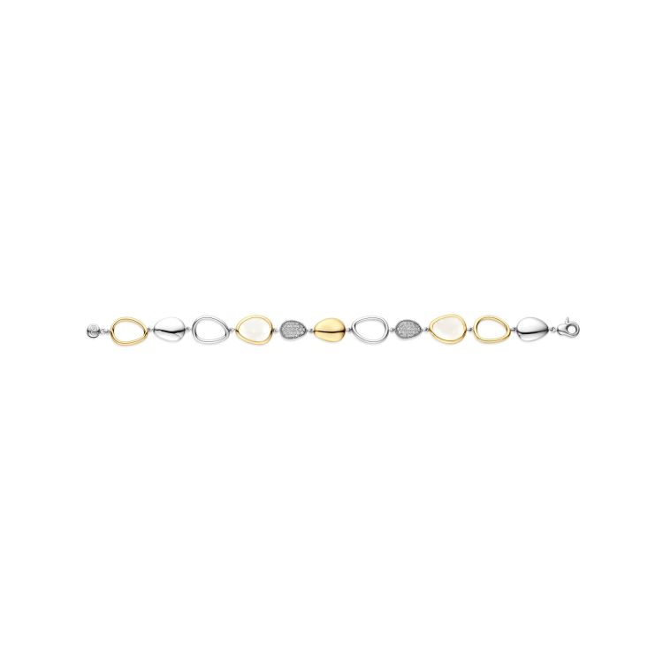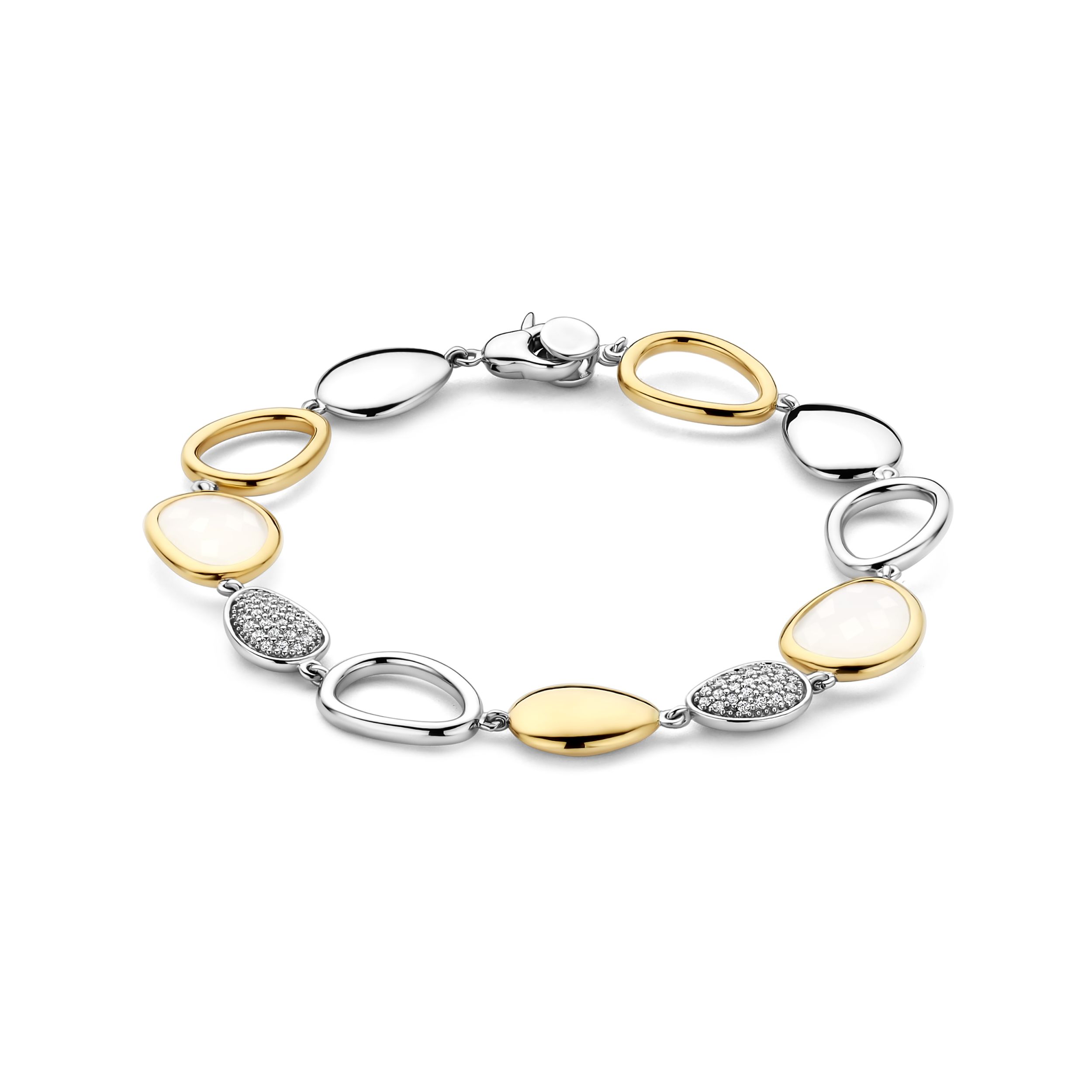 Verhoog sculpturale glans met deze TI SENTO zilveren armband 23082MW. Zorgvuldig vervaardigd uit 925 sterling zilver, verbindt het sieraad een reeks pebble-vormige charms tot één vloeiende lijn: een melkachtig witte fantasy-cut steen omlijst met goudkleurig verguld, een gepolijste goudkleurig vergulde pebble, pavé-schijfjes bezet met briljant witte cubic zirconia, en opengewerkte platinakleurig vergulde accenten die luchtige negatieve ruimte creëren. Het resultaat is een ritmisch spel van licht, kleur en textuur dat de pols omhult met directe elegantie. Draag de armband solo voor een gallery-waardige impact, of combineer hem met minimalistische bangles voor extra diepte. Nikkelvrij en hypoallergeen, verfijnd voor de gevoelige huid en met luxe comfort dat de hele dag aanhoudt.