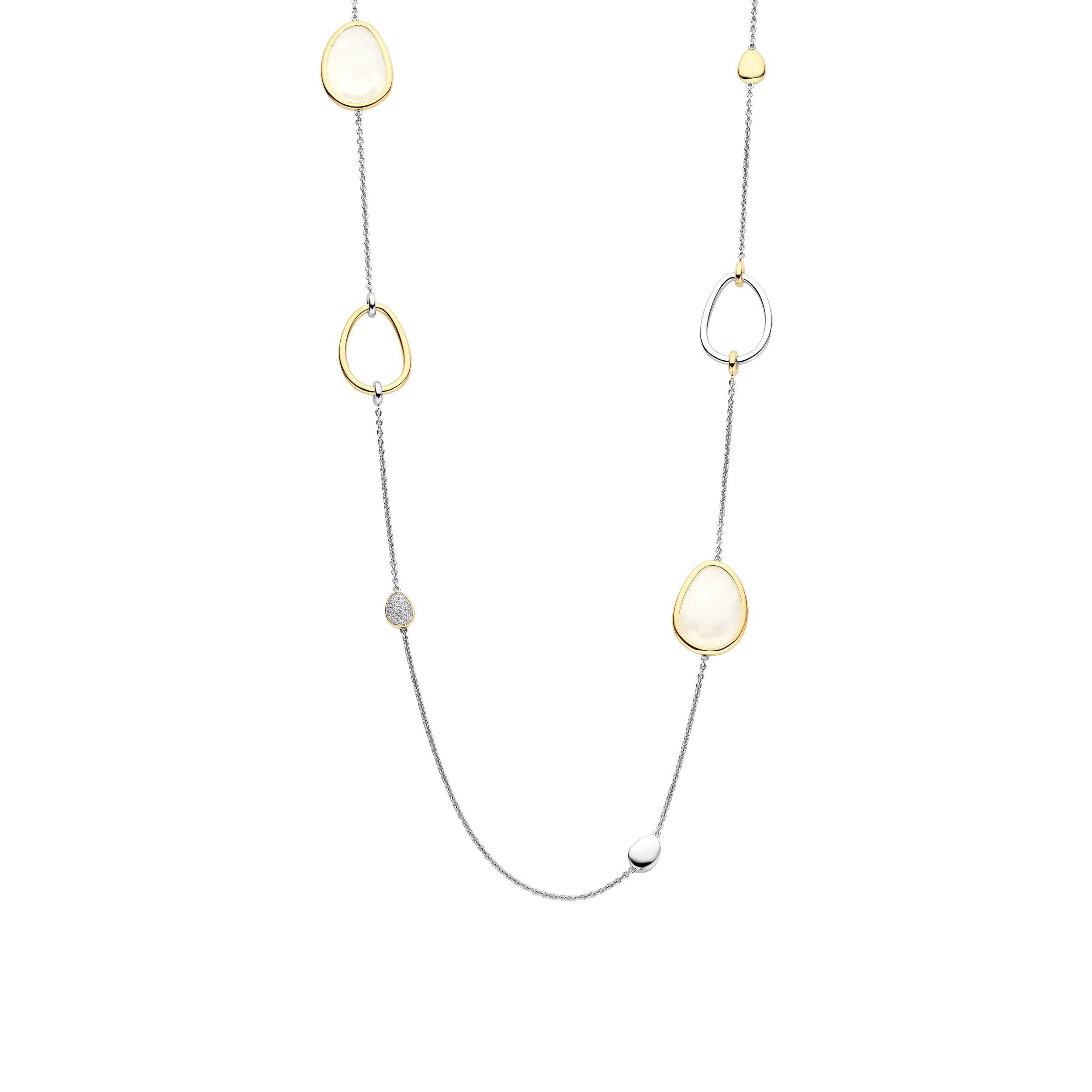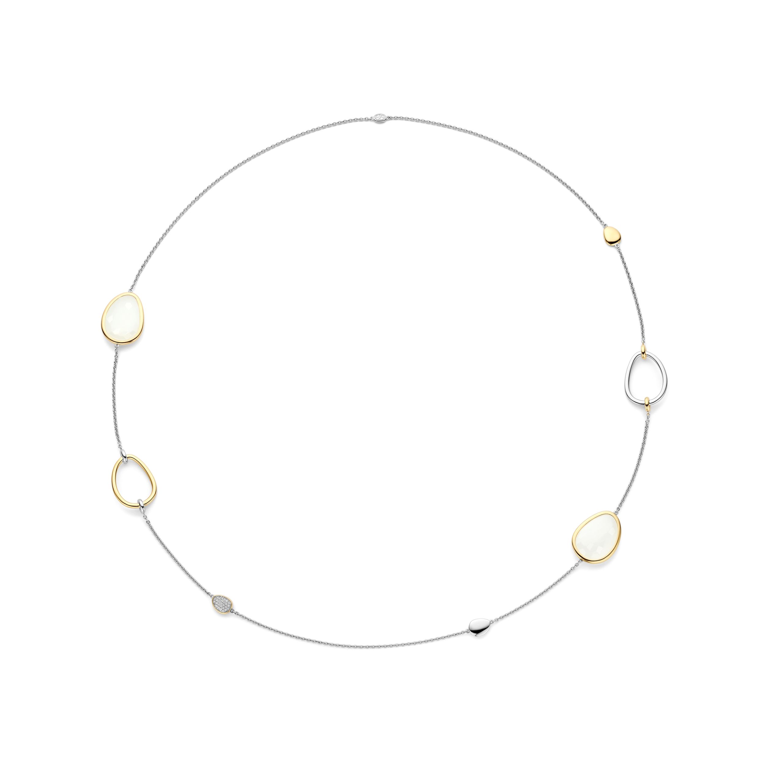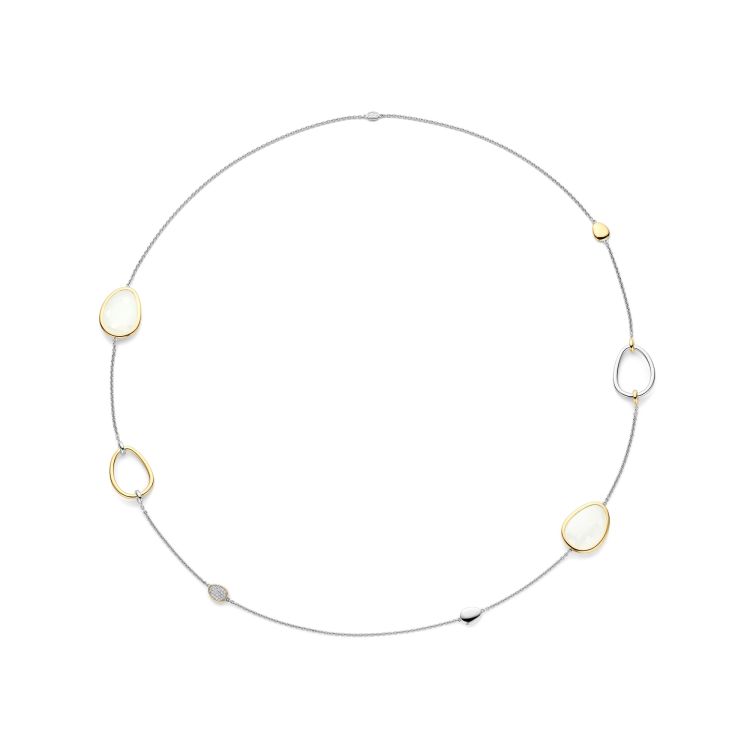 Ontdek organisch ritme met dit TI SENTO vergulde collier 34102MW/80. Vervaardigd uit 925 sterling zilver toont dit lange station collier een elegant spel van asymmetrische, kiezelvormige accenten, sommige pavé gezet met zirconia, andere omlijst door goudkleurige vergulding of afgewerkt met een spiegelgepolijste platinakleurige glans. Gefacetteerde parelmoerstenen geven een stralende, natuurlijke gloed en versterken het zachte, vrije karakter van het collier. Langs een fijn zilveren collier lijken de elementen zorgvuldig geplaatst en toch speels spontaan, een echo van de serene verspreiding van gladde kiezels langs een rivierbedding. Of het nu wordt gecombineerd met kortere colliers of alleen gedragen voor een minimalistisch effect, dit sieraad brengt moeiteloze verfijning in zowel dagelijkse als avondlooks. Een eigentijdse interpretatie van klassieke parel- en schakelcolliers, waarin subtiele beweging en elegantie samenkomen. Combineer met bijpassende oorbellen, armbanden of ringen uit de TI SENTO collectie voor een krachtig sieradenstatement. Nikkelvrij en hypoallergeen, het biedt optimaal comfort en tijdloze draagbaarheid.