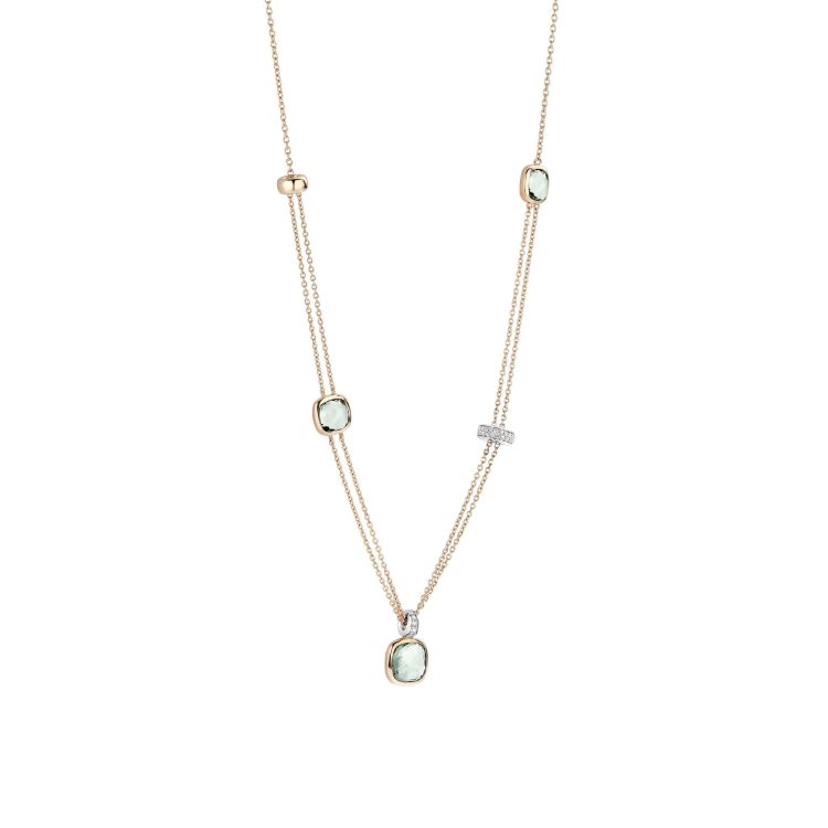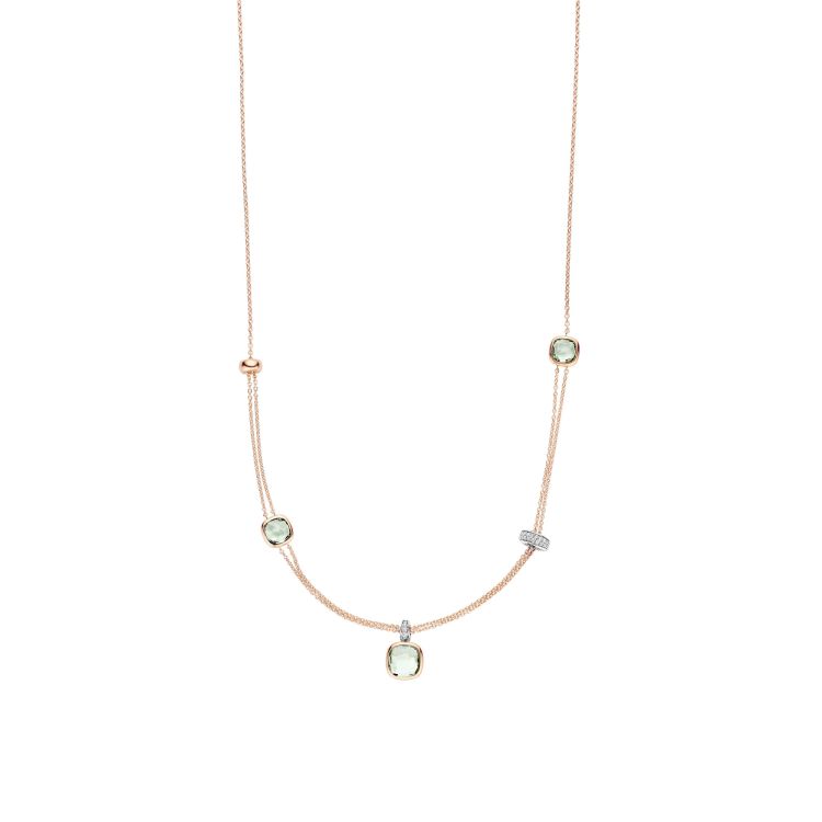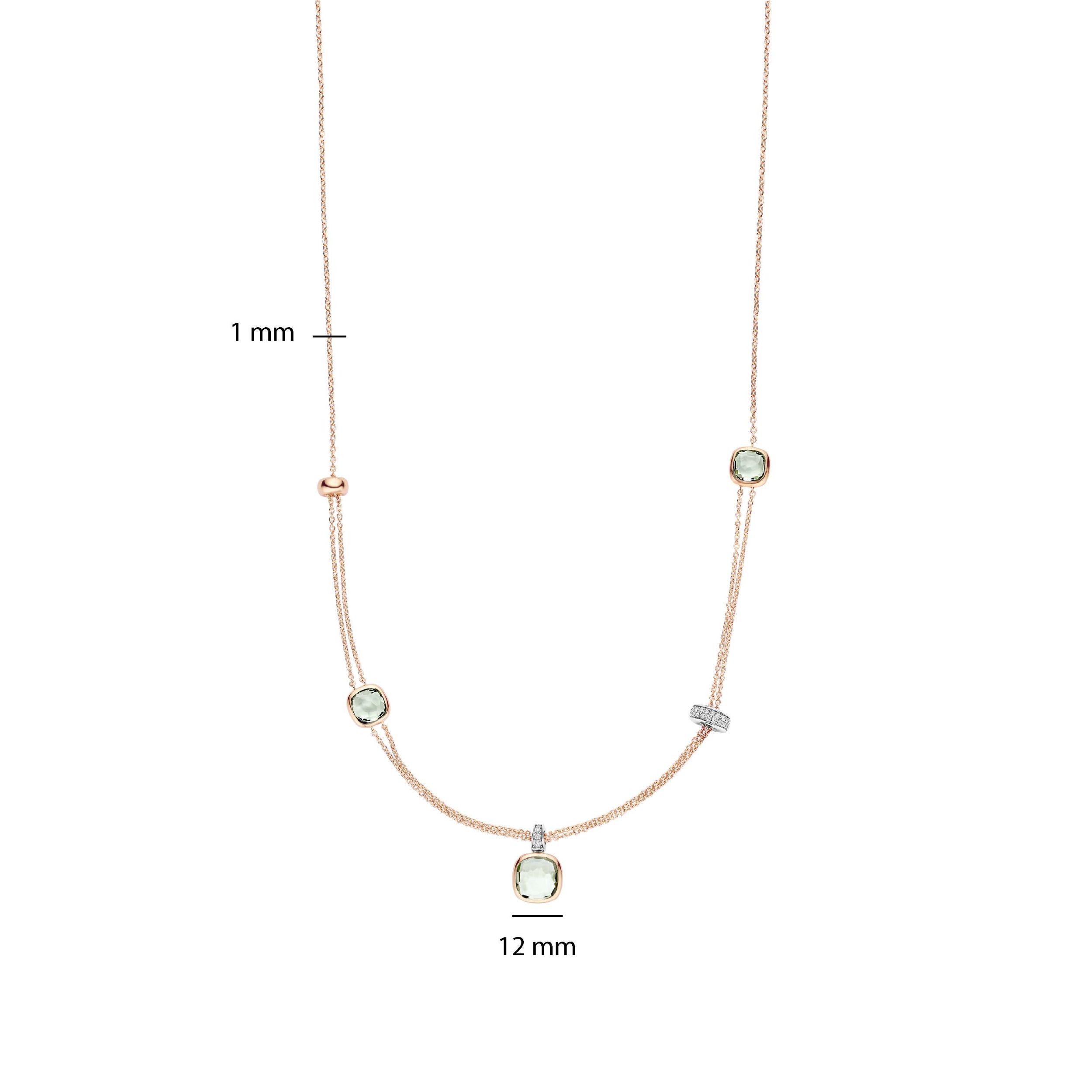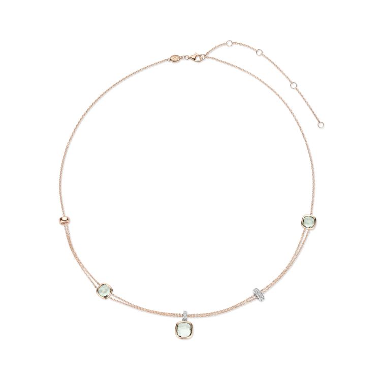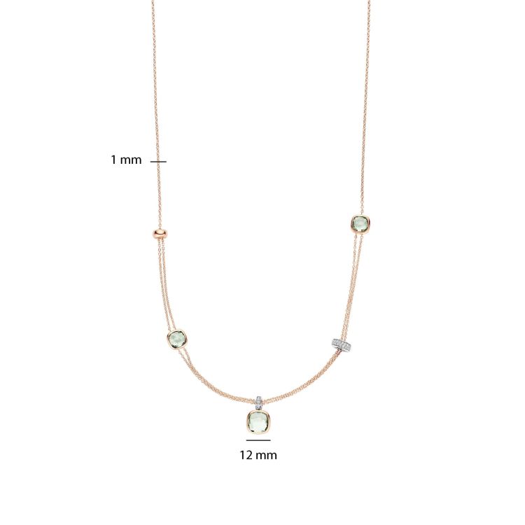De combinatie van de frisse groene tint, de warme rosé-goudkleurigee afwerking en de fonkelende zirkonia zorgt voor een rijk lichtspel waarbij het licht mooi op de stenen valt. Dankzij het slanke kettinkje en het gelaagde ontwerp is deze cushion ketting eenvoudig te combineren met andere rosé-goudkleurigee of zilveren kettingen, maar ook perfect om solo te dragen als stijlvol middelpunt van uw look. 34122GR/50 Cushion & Rectangular ketting