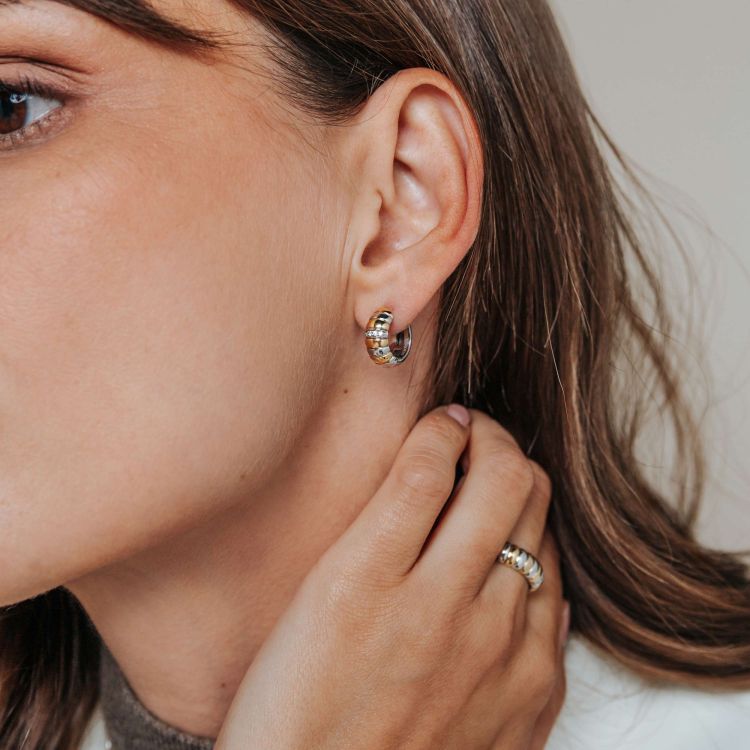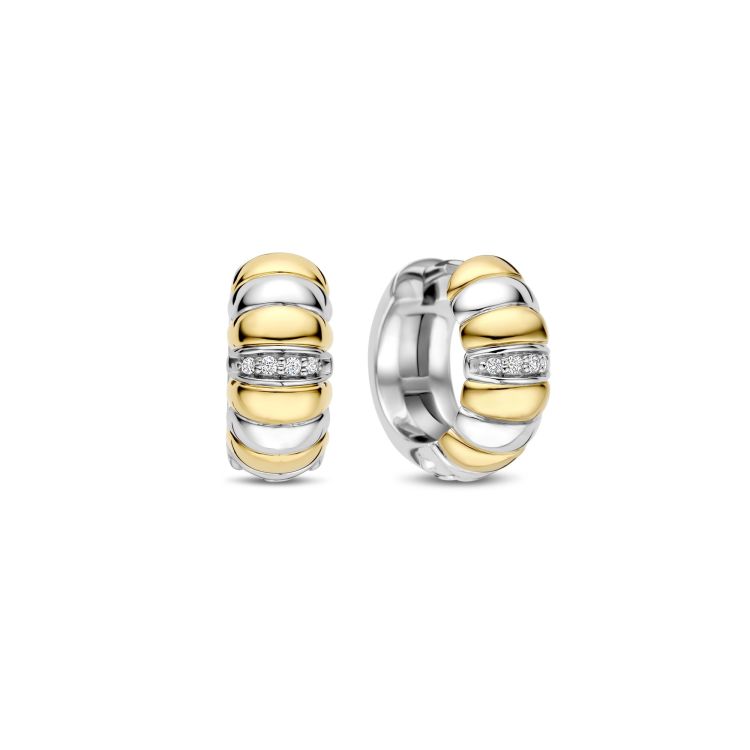 Geniet van sculpturale elegantie met deze TI SENTO goudkleurig vergulde zilveren oorbellen 78024ZY. Vervaardigd uit 925 sterling zilver, heeft elke oorbel een ritmische reeks van goudkleurig vergulde en platinakleurig vergulde schakels, geaccentueerd door een centrale band van pavé-gezette witte cubic zirconia. Hun verfijnde geometrie speelt met licht en textuur en weerspiegelt de vloeiende beweging van architectonische vormen. Gedurfd maar draagbaar, ze tillen zowel strakke tailoring als vloeiende zijde naar een ingetogen luxueus niveau. Combineer ze met de bijpassende armband of ring voor een samenhangende, high-impact look. Nikkelvrij en hypoallergeen, voor luxe comfort van dag tot nacht.