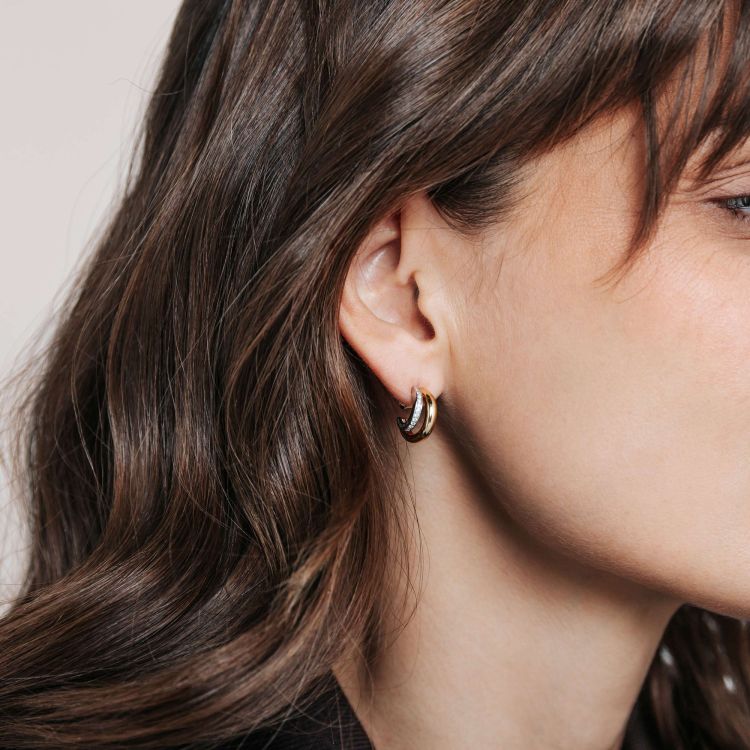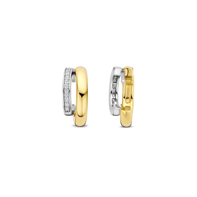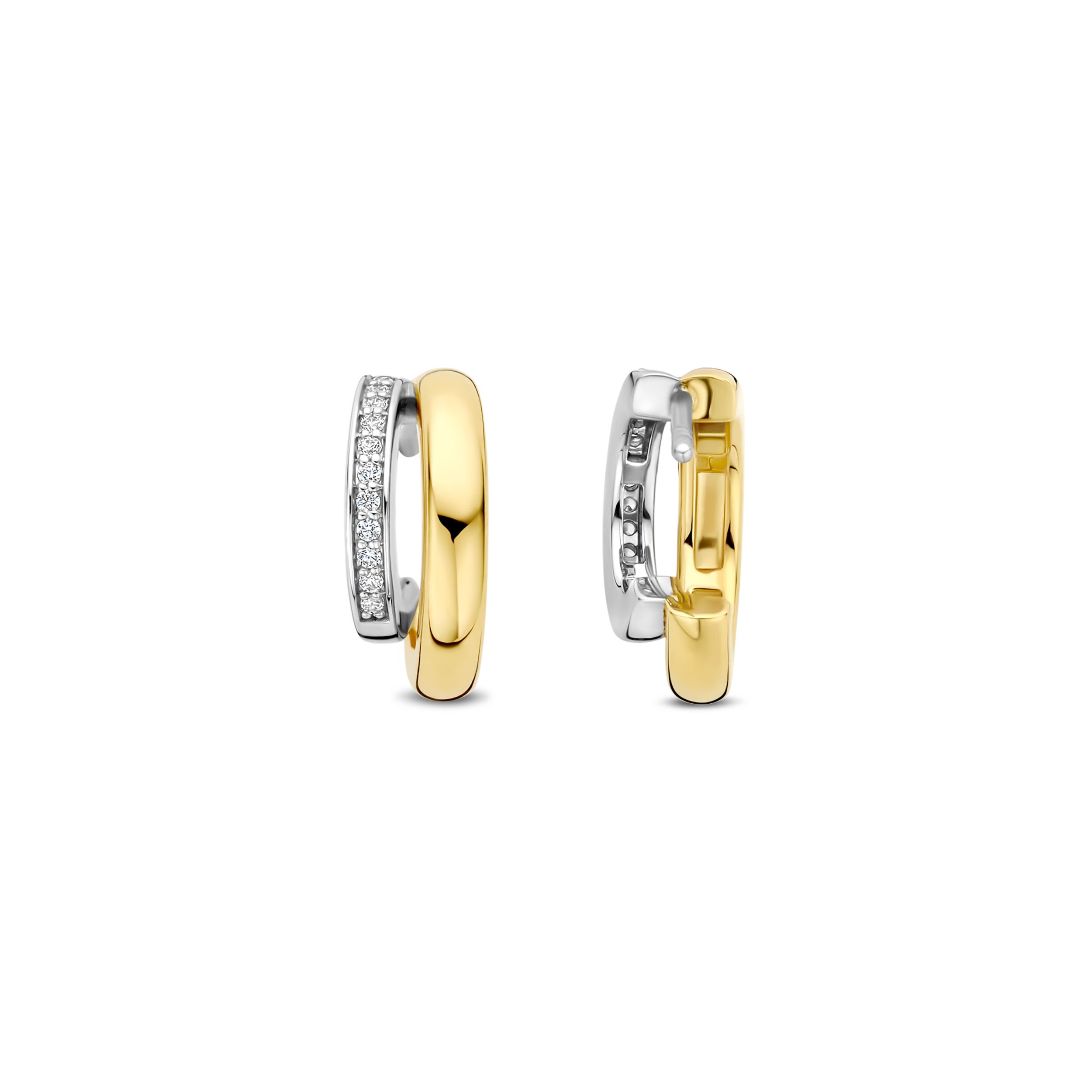 Omarm sculpturaal contrast met deze TI SENTO goudkleurig vergulde zilveren oorbellen 78035ZY. Vervaardigd uit 925 sterling zilver, vormt elke oorbel een gedurfde, asymmetrische ring bestaande uit twee in elkaar grijpende bogen: één strak en goudkleurig verguld, de ander platinakleurig verguld en pavé-gezet met briljant geslepen witte cubic zirconia. De vloeiende compositie creëert een subtiel samenspel van licht, kleur en textuur—perfect om zowel minimalistische outfits als avondlooks te verrijken. Compact maar opvallend, bieden ze een verfijnde twist aan klassieke hoops. Nikkelvrij en hypoallergeen, ze garanderen moeiteloze elegantie en draagcomfort voor de gevoelige oren gedurende de hele dag.
