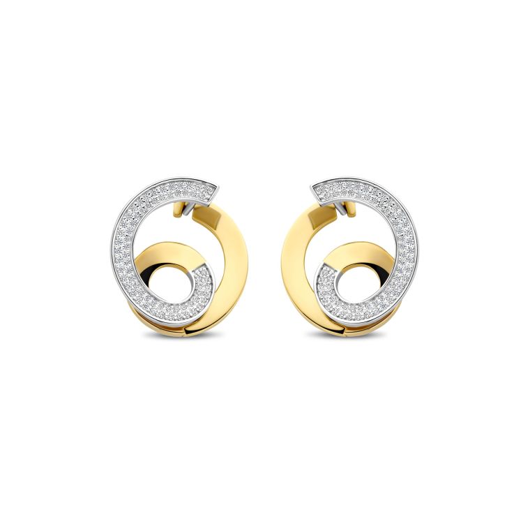 sterling zilver en afgewerkt met een stralende goudkleurige vergulding trekt hun dubbele swirl-ontwerp de blik naar binnen met een dynamisch gevoel van beweging. Een pavé gezette binnen- en buitenspiraal fonkelen met zirconia en creëren een hypnotisch spel van licht en dimensie. Met een diameter van 18 mm bieden deze oorbellen gedurfde geometrie met een zachte twist, perfect om minimalistische looks te versterken of avondoutfits te verfijnen. Nikkelvrij en hypoallergeen, ze zijn even comfortabel als opvallend.