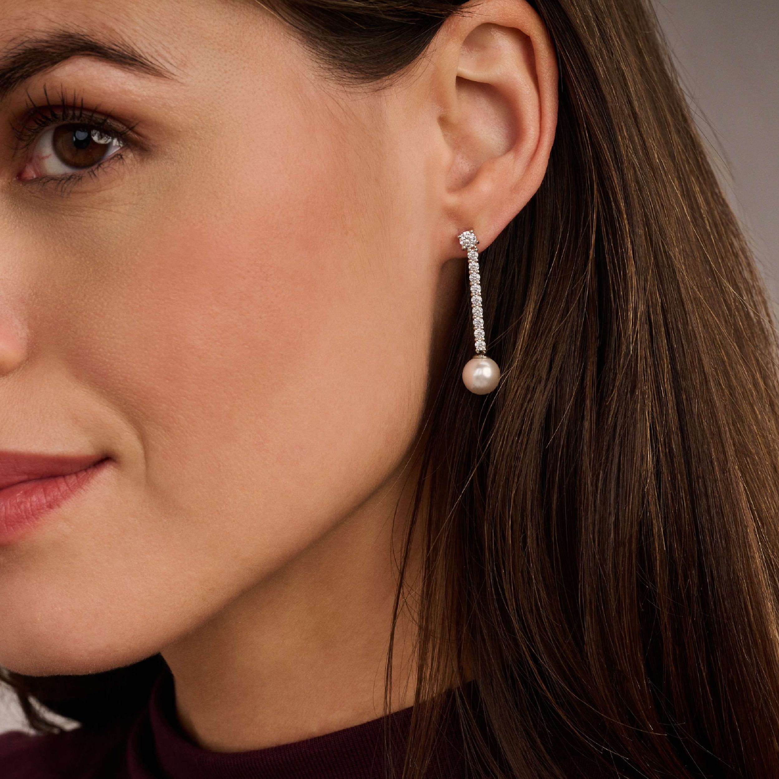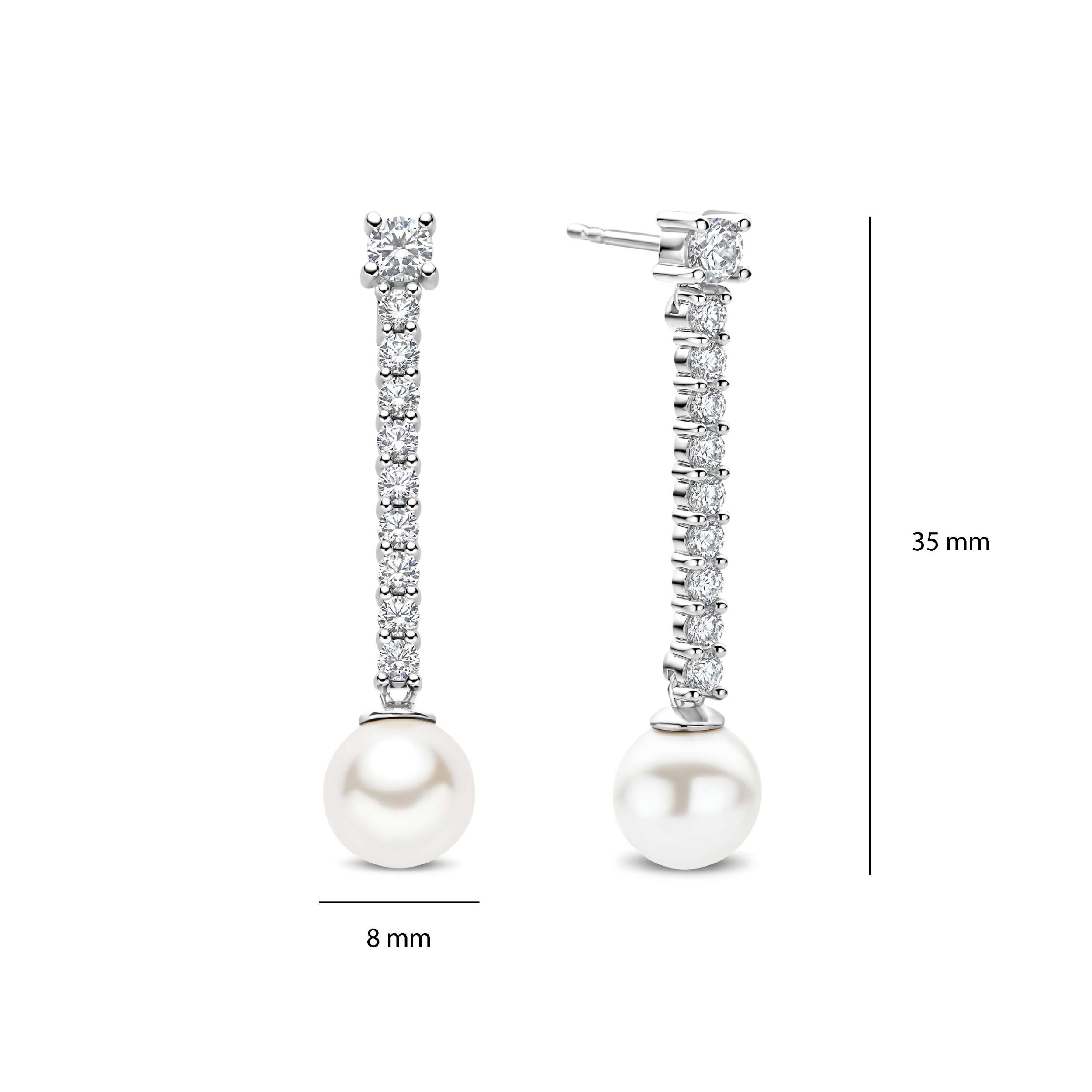 Deze lange zirkonia parel oorbellen zijn vervaardigd uit hoogwaardige kwaliteit 925 sterling zilver en uitgevoerd als elegante oorknopjes. Een slanke rij fonkelende zirkonia steentjes loopt verticaal naar beneden en wordt onderaan afgerond met een parel met kristallen kern. De combinatie van de fijne zirkonia en de zachte glans van de parel zorgt voor een verfijnd lichtspel en een uitgebalanceerd ontwerp.