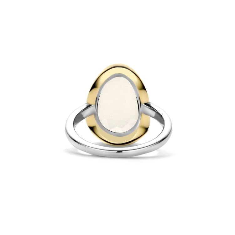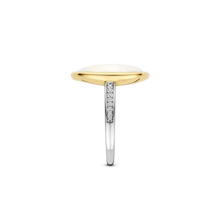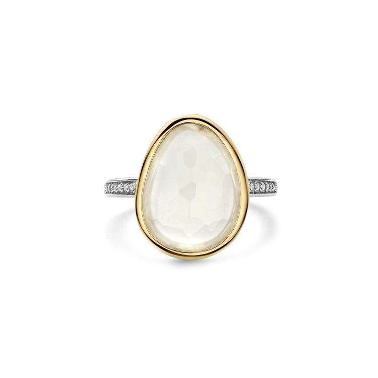 Omarm een zachte glans met deze TI SENTO goudkleurig vergulde zilveren ring 12386MW. Gevormd uit 925 sterling zilver en afgewerkt met een spiegelend platinakleurig laagje, leidt de slanke band het oog naar een onregelmatige, melkachtig witte steen waarvan het gefacetteerde “pebble”-oppervlak zachtjes straalt bij elke beweging. Een warme goudkleurig vergulde rand omlijst de steen en voegt een subtiel contrast toe, terwijl een taps toelopende lijn van pavé-gezette witte cubic zirconia langs één zijde van de band een ingetogen sprankeling geeft. Draag de ring solo voor modern minimalisme, of stapel hem met slanke metallic ringen om je eigen glans samen te stellen. Nikkelvrij en hypoallergeen, voor luxe comfort.