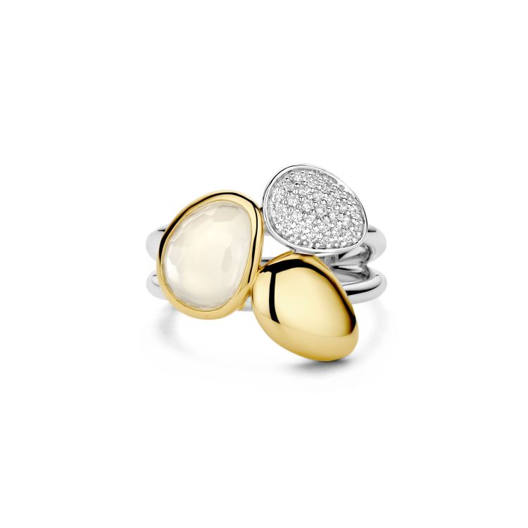 Vier moderne harmonie met deze TI SENTO goudkleurig vergulde zilveren ring 12387MW. Drie sculpturale pebble-vormen sieren de slanke, platinakleurig afgewerkte band: een melkachtig witte fantasy-cut steen omlijst met warm goudkleurig verguld, een gepolijste goudkleurig vergulde pebble die zacht licht weerspiegelt, en een platinakleurig vergulde schijf pavé-gezette met briljant witte cubic zirconia voor een subtiele sprankeling. Het asymmetrische trio creëert diepte, beweging en een kunstzinnig spel van textuur dat moeiteloos overgaat van strakke daglooks tot avondelijke zijde. Draag de ring solo voor opvallende finesse, of stapel hem met slanke metallic ringen om je eigen sprankelende verhaal samen te stellen. Zoals al onze TI SENTO sieraden is deze ring nikkelvrij en hypoallergeen, en combineert blijvende stijl met comfortabel draagplezier.
