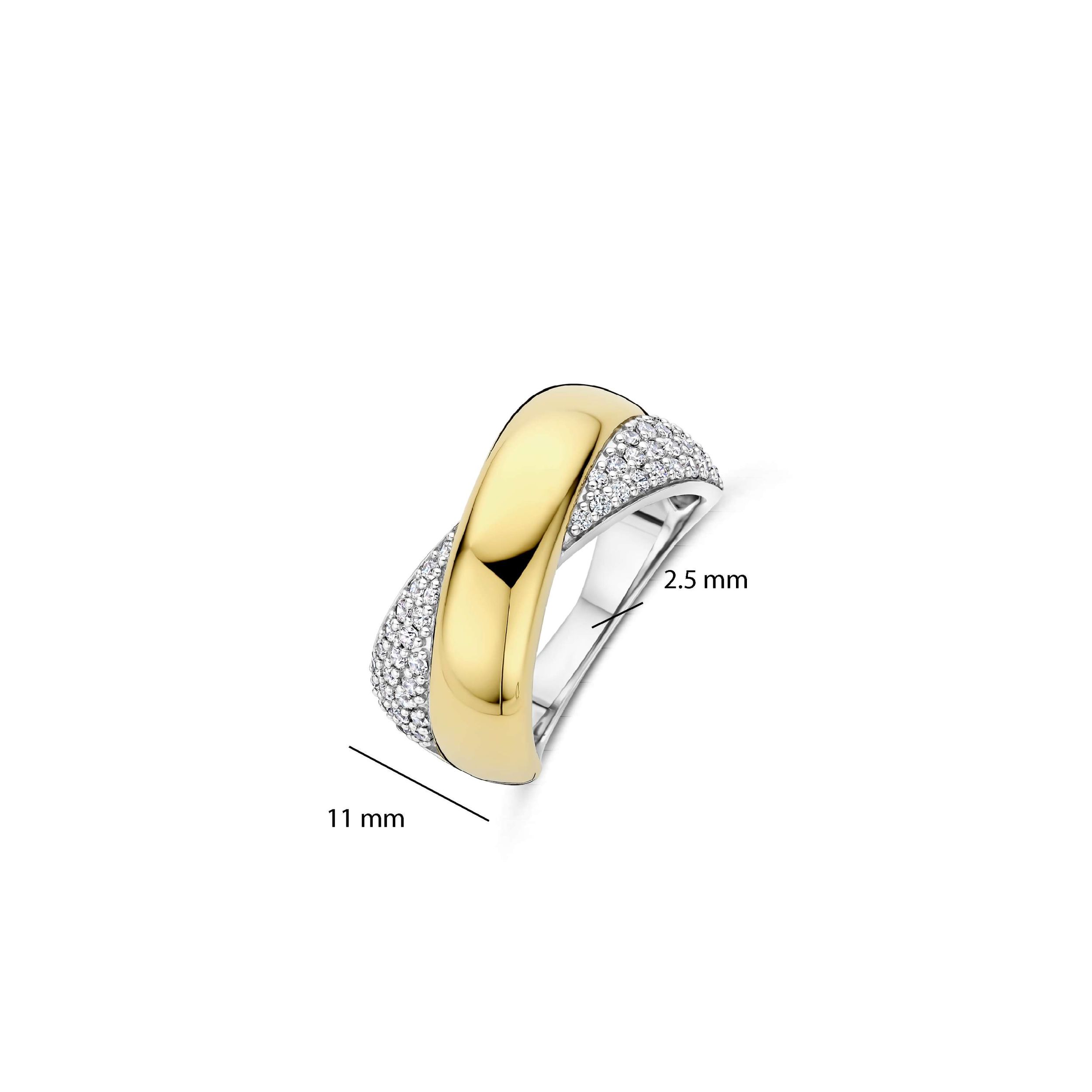 Deze Bold Zirkonia Crossover Ring is vervaardigd uit hoogwaardige kwaliteit 925 sterling zilver en heeft een krachtig, sculpturaal ontwerp. De ring bestaat uit gekruisde banden, waarvan één band is afgewerkt met een gladde goudkleurigee afwerking en de andere band is bezet met zirkonia steentjes. Het contrast tussen de strakke, glanzende band en de fonkelende zirkonia geeft de ring diepte en een uitgesproken uitstraling.