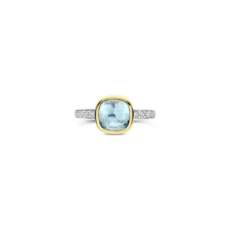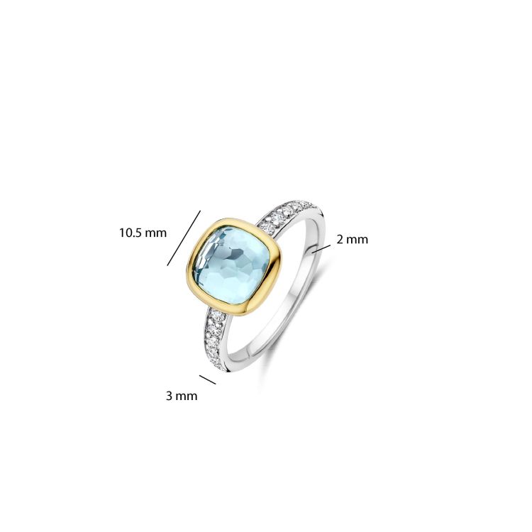Deze zirkonia ring met goudkleurige setting en lichtblauwe cushion steen is vervaardigd uit hoogwaardige kwaliteit 925 sterling zilver en heeft een verfijnd, evenwichtig ontwerp. De ring is afgewerkt met een lichtblauwe cushion geslepen steen, die zacht licht vangt en het ontwerp een frisse, heldere uitstraling geeft. De goudkleurige setting omlijst de steen op elegante wijze, terwijl de band is verrijkt met zirkonia steentjes voor extra schittering en detail.