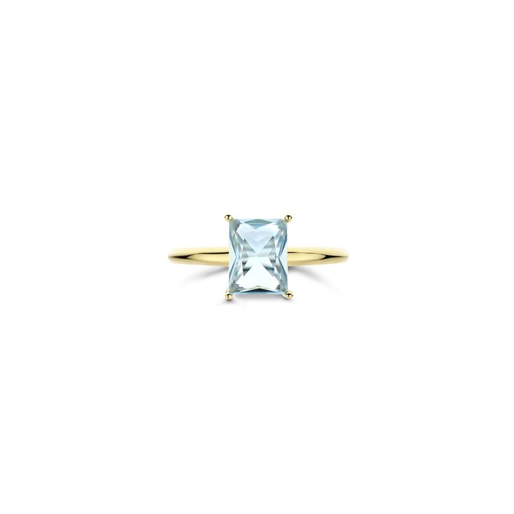 Deze goudkleurige ring met een lichtblauwe steen is vervaardigd uit hoogwaardige kwaliteit 925 sterling zilver en heeft een helder, verfijnd ontwerp. De ring is afgewerkt met een rechthoekig geslepen lichtblauwe steen, die het licht op elegante wijze vangt en zorgt voor een subtiel, sprankelend effect. De combinatie van de goudkleurigee afwerking en de frisse blauwtint geeft de ring een zomerse uitstraling met een vleugje vintage karakter.