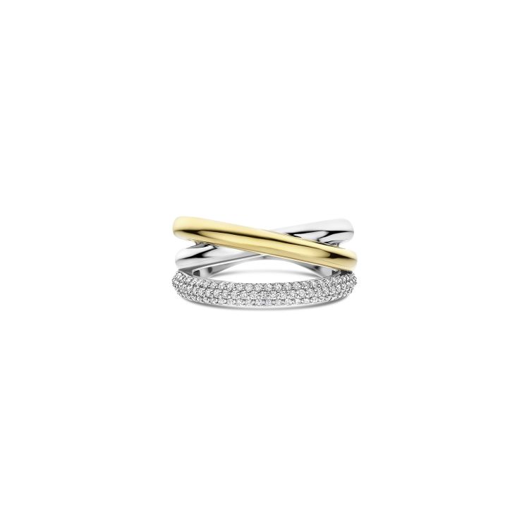 Deze statement ring voegt direct karakter toe aan elke sieradencombinatie. Draag de ring solo voor een uitgesproken accent of combineer hem met andere ringen voor een gelaagde look. Het contrast tussen goudkleur, zilverkleur en fonkelende zirkonia zorgt voor een helder, grafisch effect dat veelzijdig te stylen is. 12422ZY Structures ring