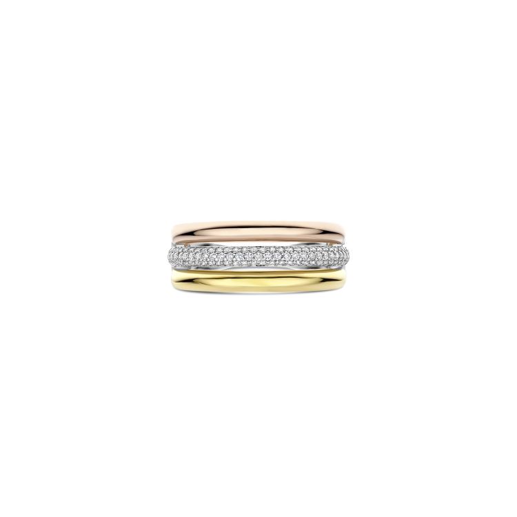 Deze statement ring is volledig on trend dankzij het tricolor design en laat zich moeiteloos combineren met andere sieraden. Draag de ring solo als stijlvol accent of combineer hem met andere ringen voor een gelaagde look. Door de mix van kleuren past deze ring bij uiteenlopende stijlen en momenten. 12427TZ Circles & Cross-over ring