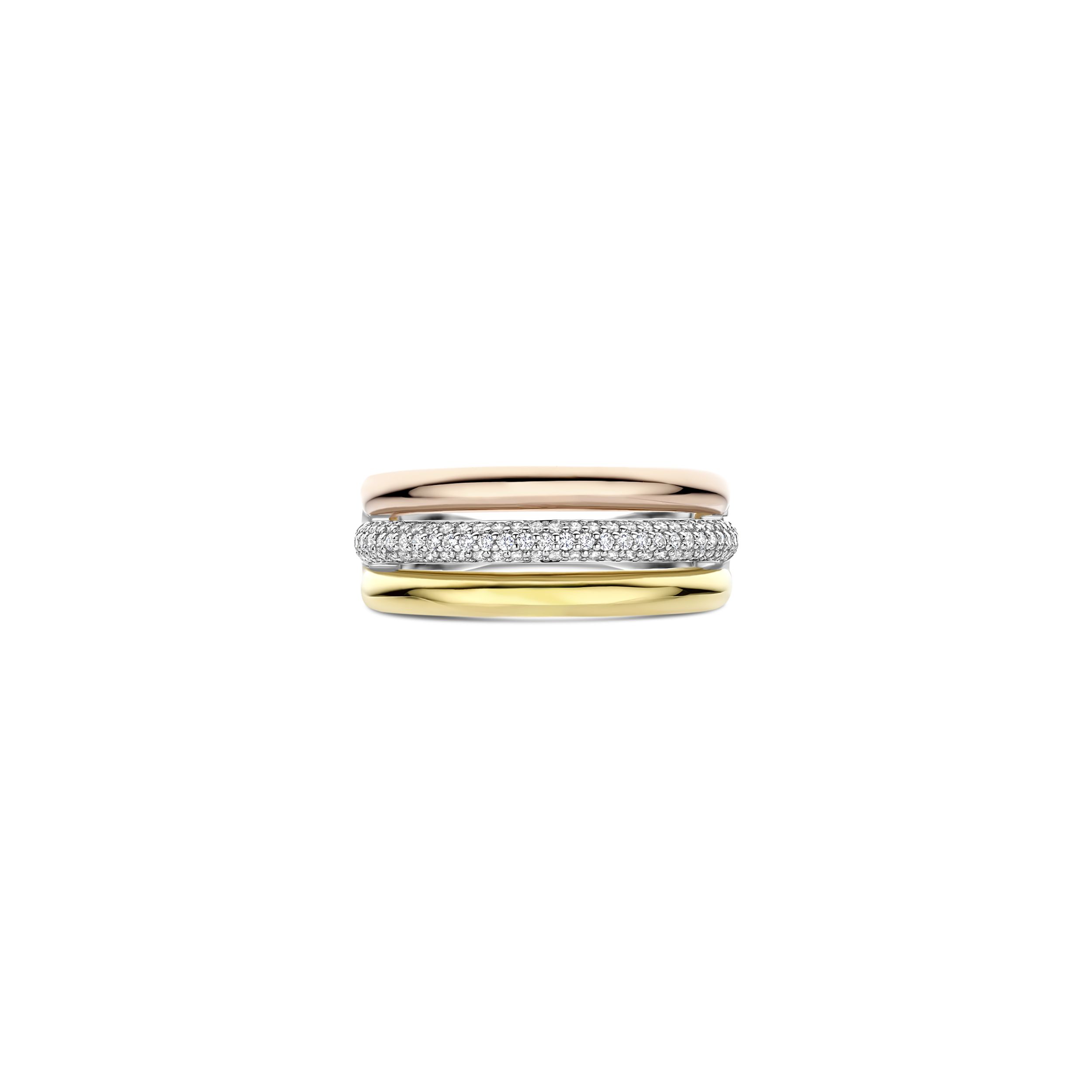 Deze tricolor ring met zirkonia steentjes is vervaardigd uit hoogwaardige kwaliteit 925 sterling zilver en heeft een verfijnd, gelaagd ontwerp. De ring bestaat uit drie banden: één goudkleurige band, één band bezet met zirkonia steentjes en één roségoudkleurigee band. De combinatie van goudkleur, zilverkleur en roségoudkleur zorgt voor een dynamisch geheel met diepte en contrast.