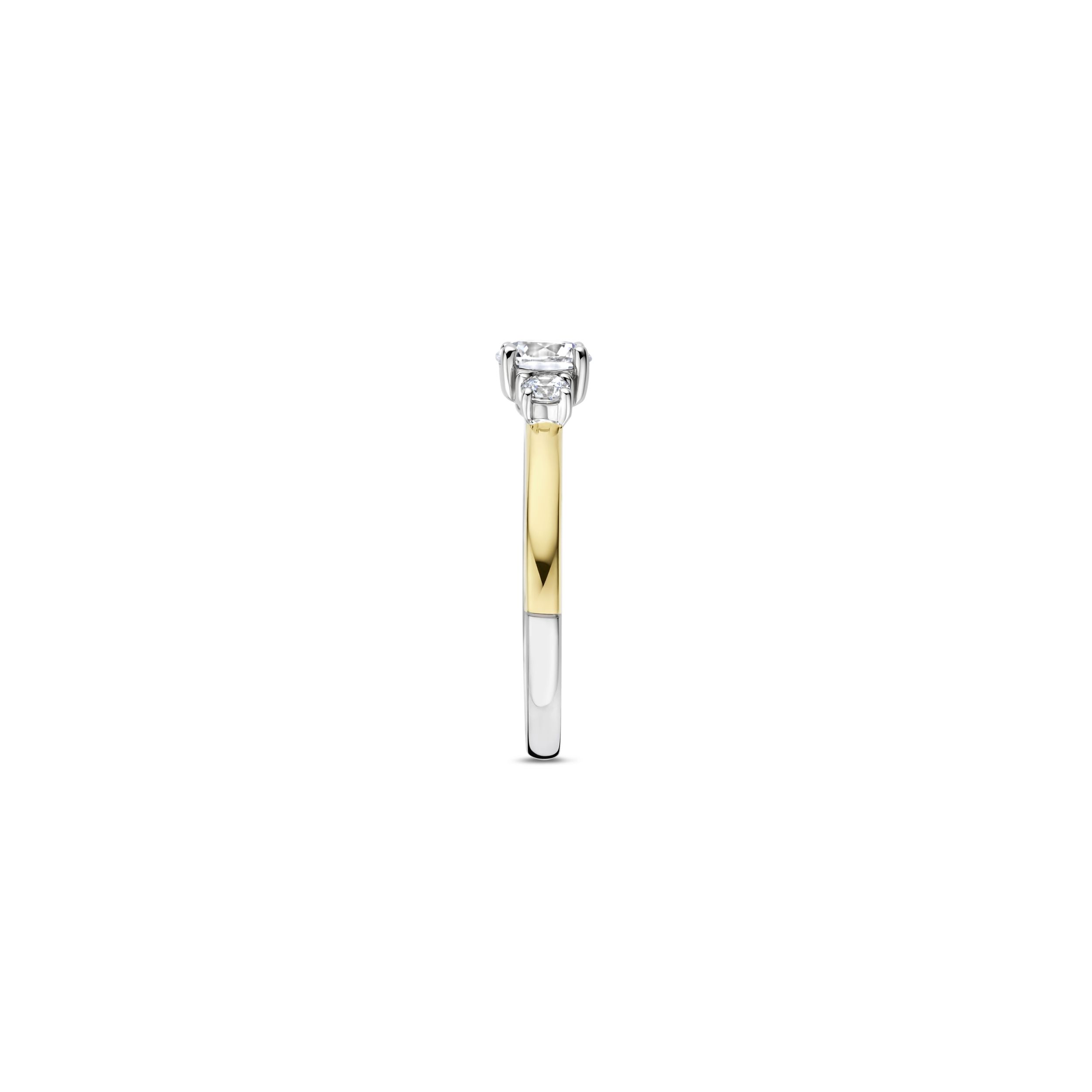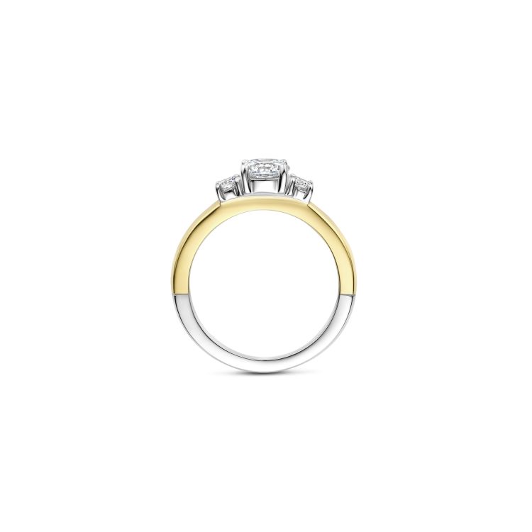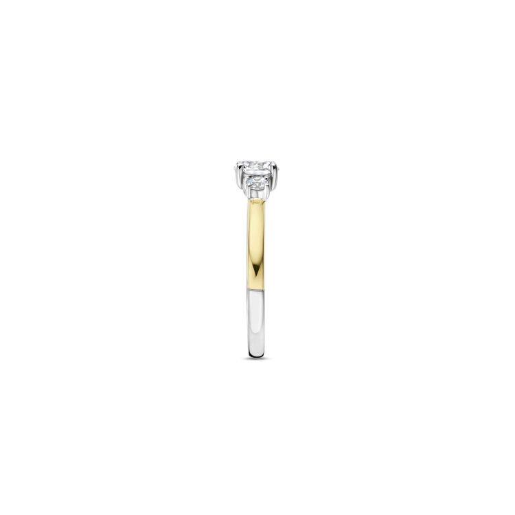 Deze goudkleurige ring met zirkonia steentjes is vervaardigd uit hoogwaardige kwaliteit 925 sterling zilver en heeft een verfijnd, tijdloos ontwerp. De ring is afgewerkt met drie centraal geplaatste zirkonia steentjes, die samen zorgen voor een uitgebalanceerde compositie en een elegante schittering. De slanke band houdt het ontwerp helder en verfijnd, waardoor de stenen volledig tot hun recht komen.