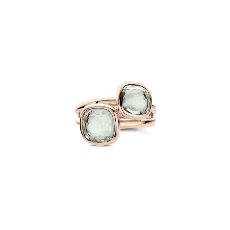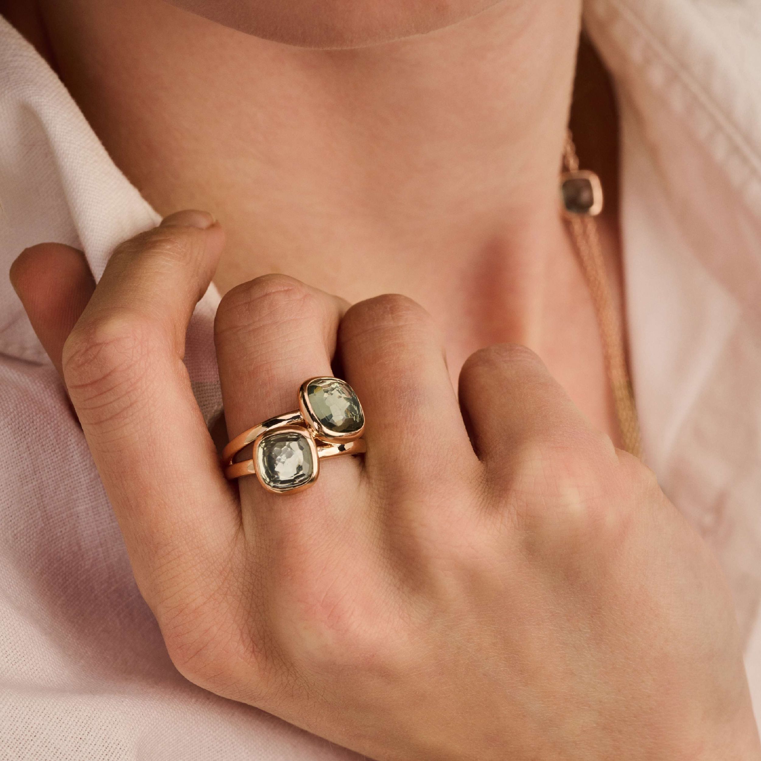 De doorschijnende stenen reageren subtiel op het licht en op de ondertoon van de huid, waardoor de groentint bij elke drager en in elk moment nét anders tot leven komt.