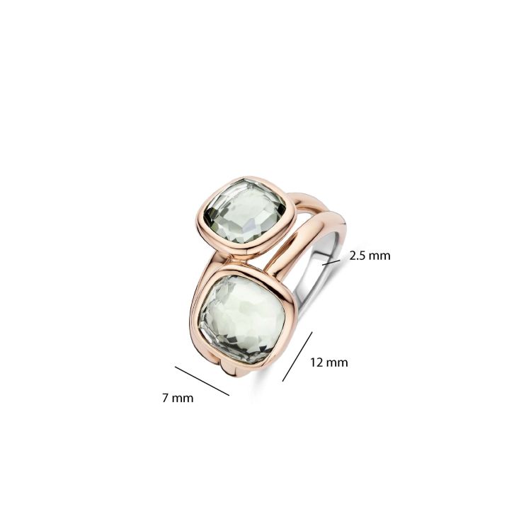 Dit is een statement ring met stenen die direct de aandacht trekt. Draag de ring solo als krachtig accent of combineer hem met andere sieraden voor een gelaagde, eigentijdse look. 12413GR Cushion & Rectangular ring