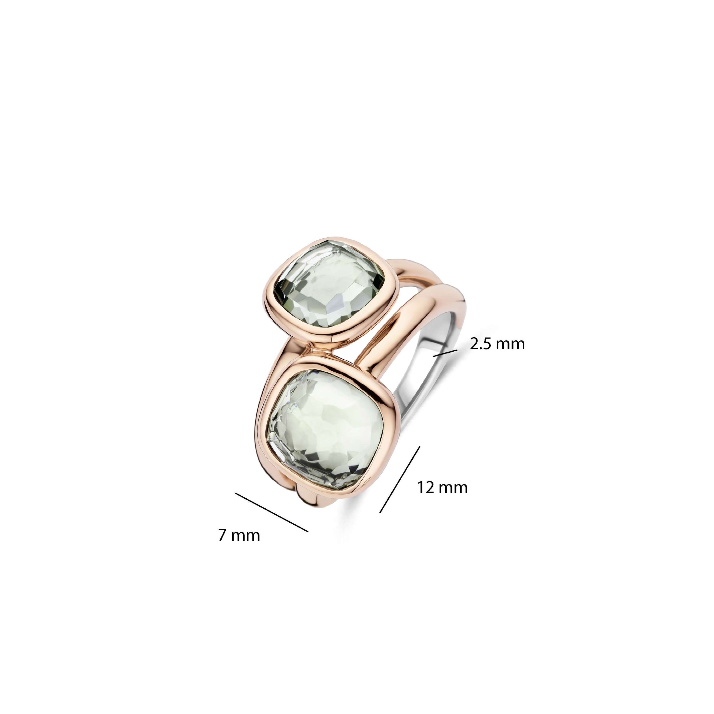 Deze ring met groene stenen is vervaardigd uit hoogwaardige kwaliteit 925 sterling zilver en afgewerkt met een verfijnde roségoudkleurigee plating. De ring heeft een uitgesproken, gelaagd ontwerp en is bezet met diepgroene stenen in een combinatie van afgeronde cushion-vormen. De warme roségoudkleur contrasteert elegant met het groen van de stenen en geeft het ontwerp een rijke, moderne uitstraling.