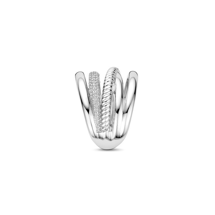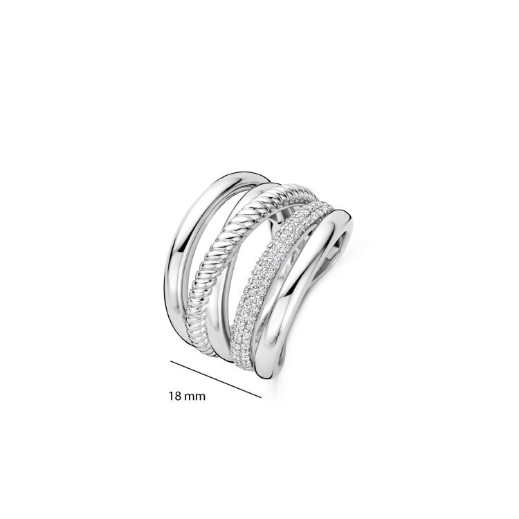Deze zilveren ring met structuren en zirkonia details is vervaardigd uit hoogwaardige kwaliteit 925 sterling zilver en heeft een uitgesproken, gelaagd ontwerp. De ring bestaat uit vijf banden met verschillende afwerkingen, waaronder een band bezet met zirkonia steentjes. Het samenspel van gladde oppervlakken, verfijnde structuren en fonkelende zirkonia creëert diepte en een krachtig lichtspel.